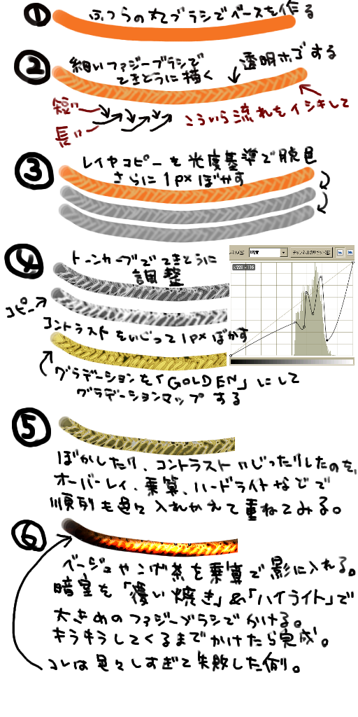 いろいろ試行錯誤した結果、ゴールドグラデのマッピングよりも、ただの着色レイヤのオーバーレイの方が綺麗に紐っぽさが出るということが判明しました。